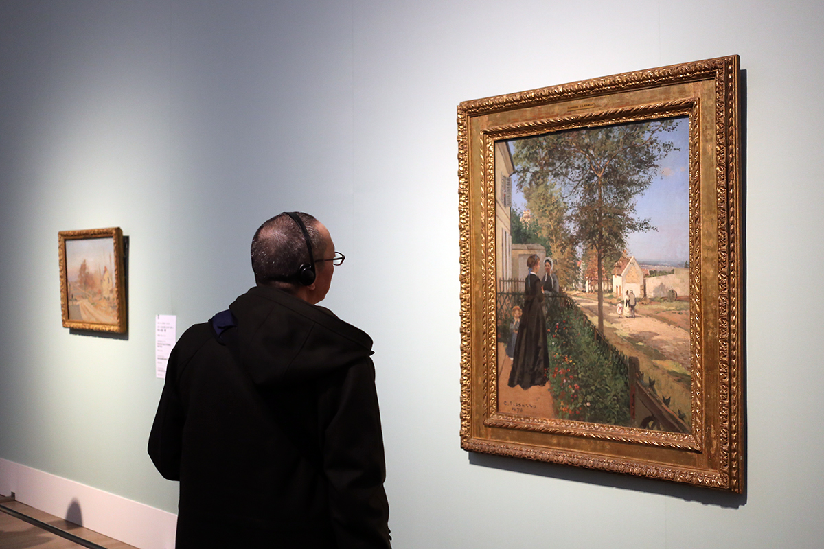 (左から)カミーユ・ピサロ《オニーからポントワーズへ向かう道 ─ 霜》1870年頃 / カミーユ・ピサロ《会話、ルーヴシエンヌ》1870年