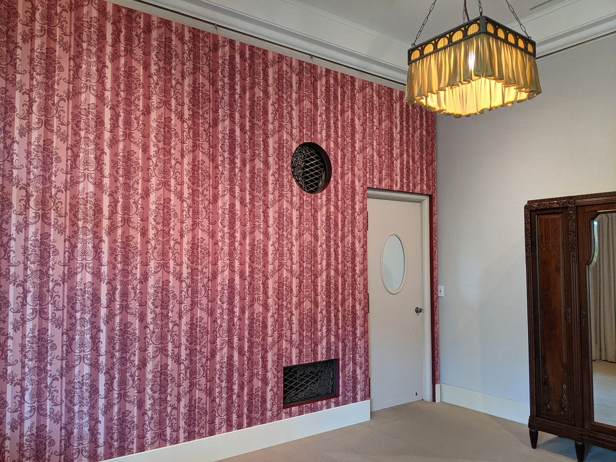 落ち着いた色味が多い中、ひときわ鮮やかだったのが妃殿下寝室でした。今回の展示のために、一面だけ壁紙が再現されていました。