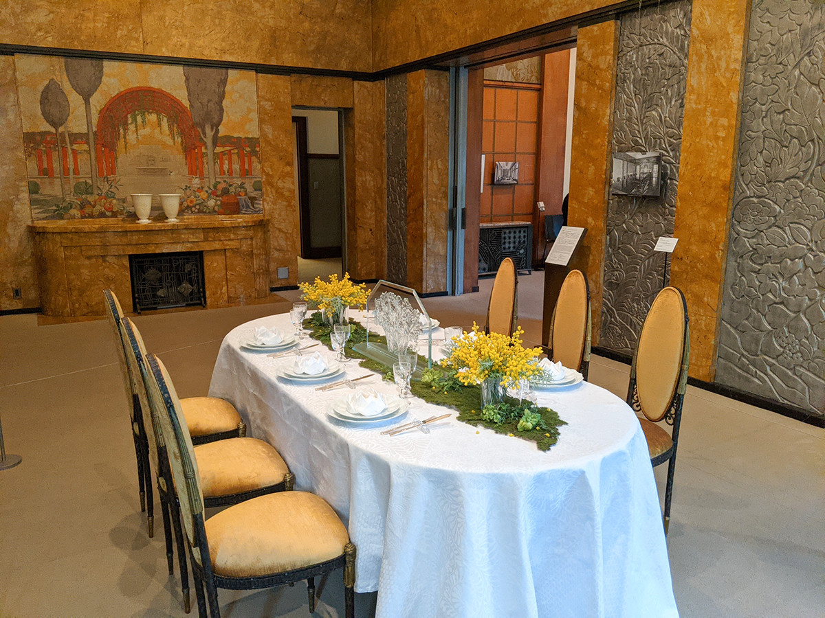来客時の会食に用いられた大食堂では、テーブルコーディネートが再現展示されていました。壁の暖色部分と、アール・デコらしさ漂うメタリックカラーの対比が印象的です。