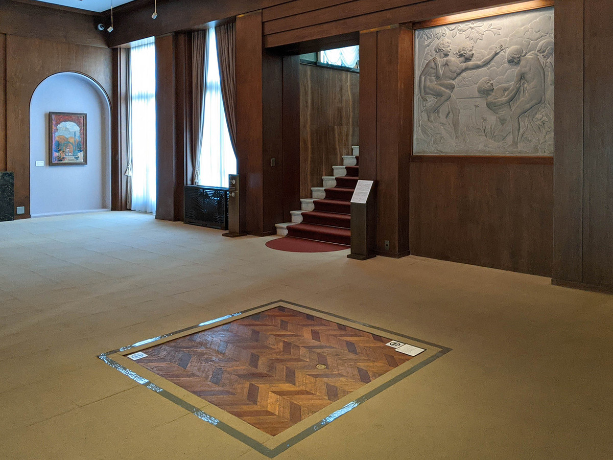受付を通り大広間に入ると、保護のためのカーペットの一部が取り払われ、元々の床を見ることができました。