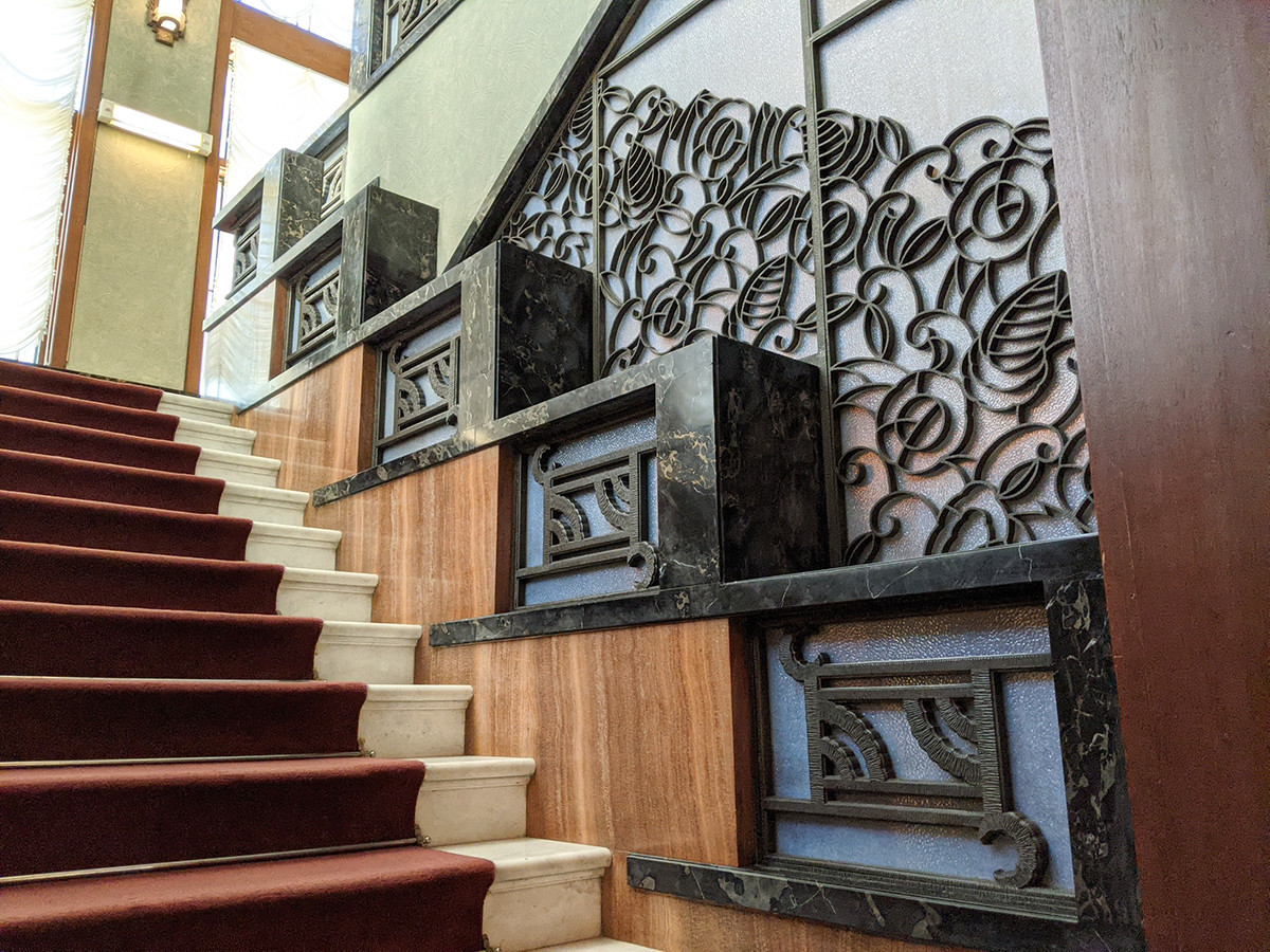 一階から踊り場までが、特に華やかです。反対に、ラパンがデザインした大広間に入ったとき、初見で見える側の階段壁はシンプルです。ここにも、設計した内匠寮の気概と配慮を感じました。