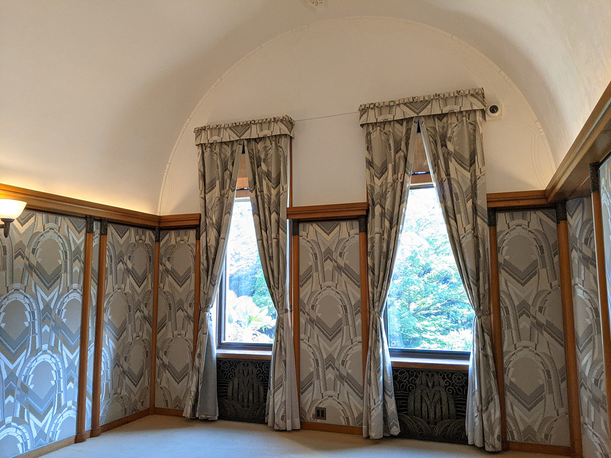 ラパンが担当した殿下居間の壁紙、カーテンはフランスのエドゥアール・ベネディクトゥスがデザインしたものが復原されています。