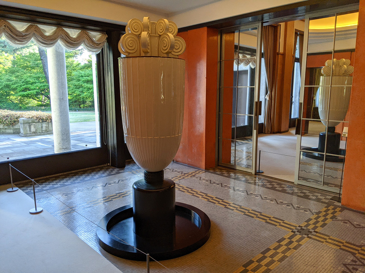これまでは意匠に目がいき、次室(つぎのま)でも香水塔だけを見てしまっていました。今回のテーマのお陰で、黒い柱がコンクリートに漆塗りだと初めて知りました。