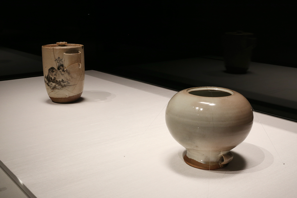 (左奥から)野々村仁清《銹絵山水図水指》江戸時代 17世紀 東京国立博物館 / 野々村仁清《白釉耳付水指》江戸時代 17世紀 出光美術館