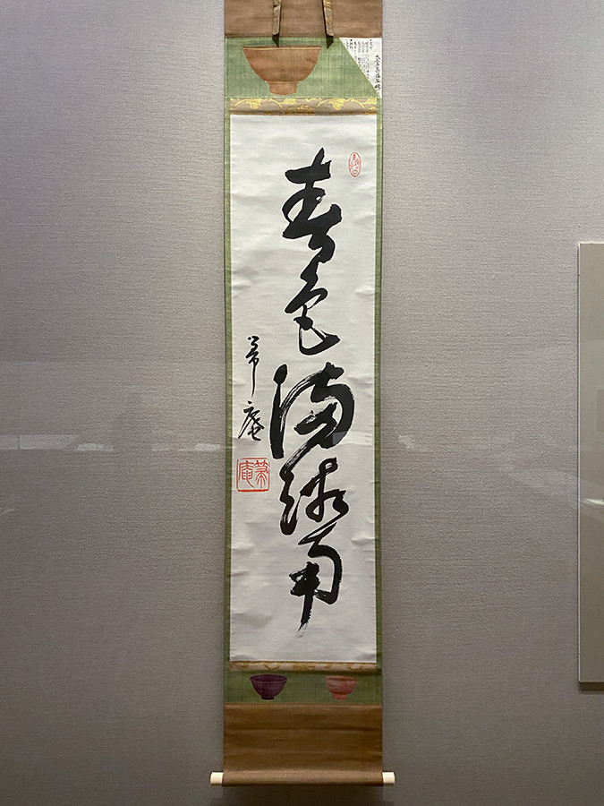 慰労会の陳列コーナーに益田鈍翁が出陳したのが、箒庵による一行書。この書は会の数日前に箒庵から送られたもので、鈍翁はすぐさま茶碗の裂を貼り付けた表装を施して、この慰労会で披露。出席者を驚かせたと伝わります。