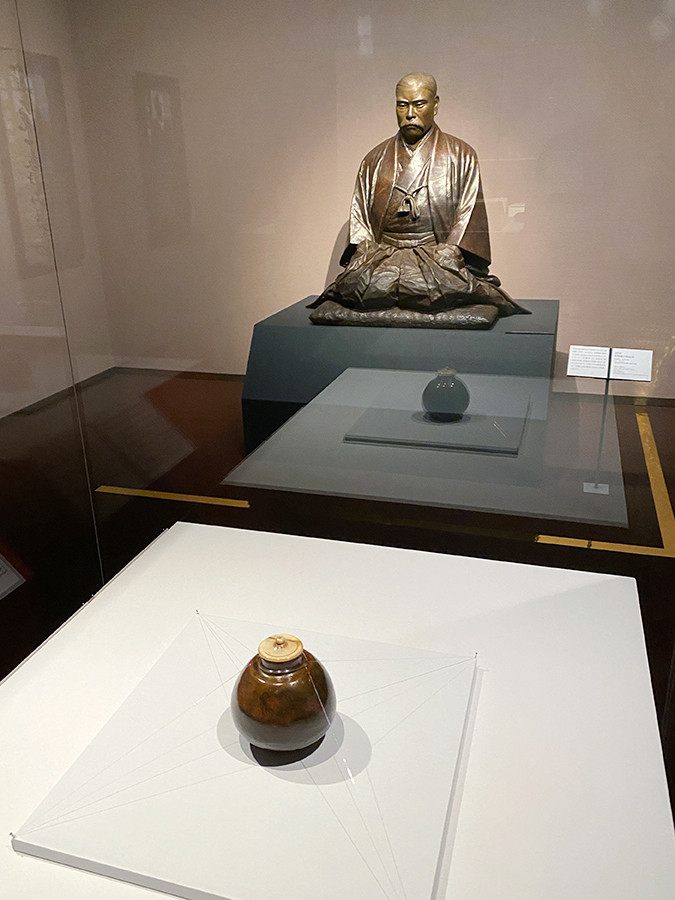 (奥)《岩崎彌太郎座像》大熊氏廣 明治時代 1890年代 三菱経済研究所付属三菱史料館 / (手前)《唐物茄子茶入 付藻茄子》南宋-元時代 13-14世紀 静嘉堂[展示期間:6月30日~8月9日]