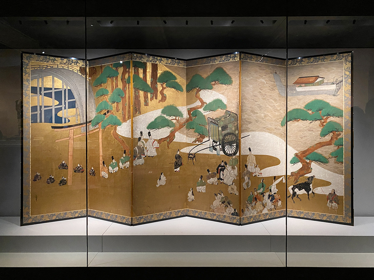 俵屋宗達は、住吉詣の華麗な源氏一行に遭遇した明石君が参詣せずに去る場面を、明石君も光源氏も描かないという大胆な構成で表現しています。