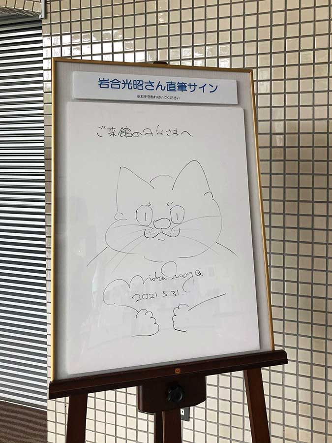 会場の出口には、岩合光昭の直筆サインが飾ってあります。また、ネコを飼っている方に“ご自慢のネコ写真も募集中”です。お名前を記入し、L版サイズ以下のお写真をもって受付へ提出すると、会場出口にずらりと展示されます。