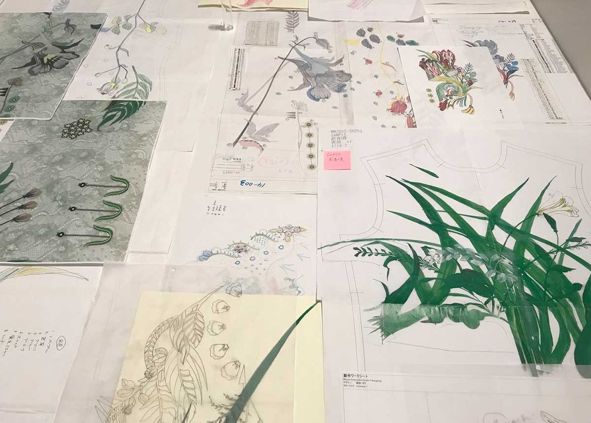 「曲線」「夢」「旅」「私小説」「色」など、ブランドを構成する10のキーワードから成る本展。「刺繍」のパートでは、ドローイングや工場への指示が書きこまれた図案などが公開されています。細かな作業に驚きつつ、デザイナーという仕事を垣間見た気分です。