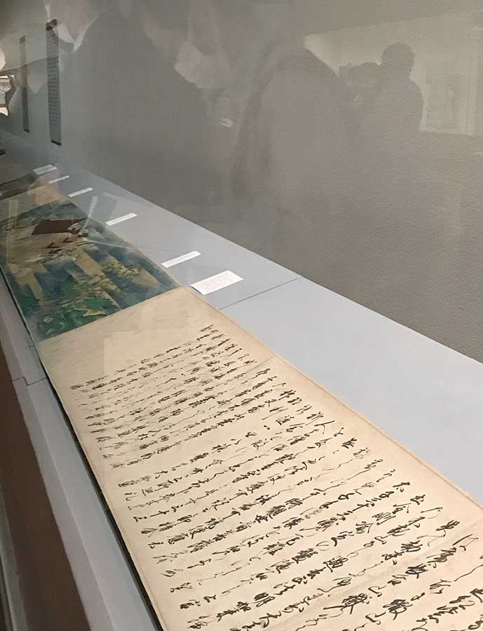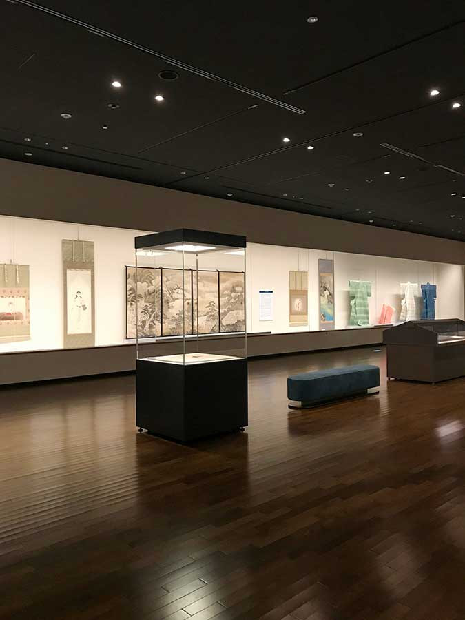 この絵巻を案内役として「パノラマの視点」、「ストーリーを描く」、「祈りの情景」の3つの観点で同館のコレクションが展示されています。重要文化財の《近江名所図》(後期展示)、滋賀ゆかりの物語を描いた三橋節子の《田鶴来》(前期展示)、そして源氏物語をモチーフにした志村ふくみの《花散里》(後期展示)など見応えがあります。
