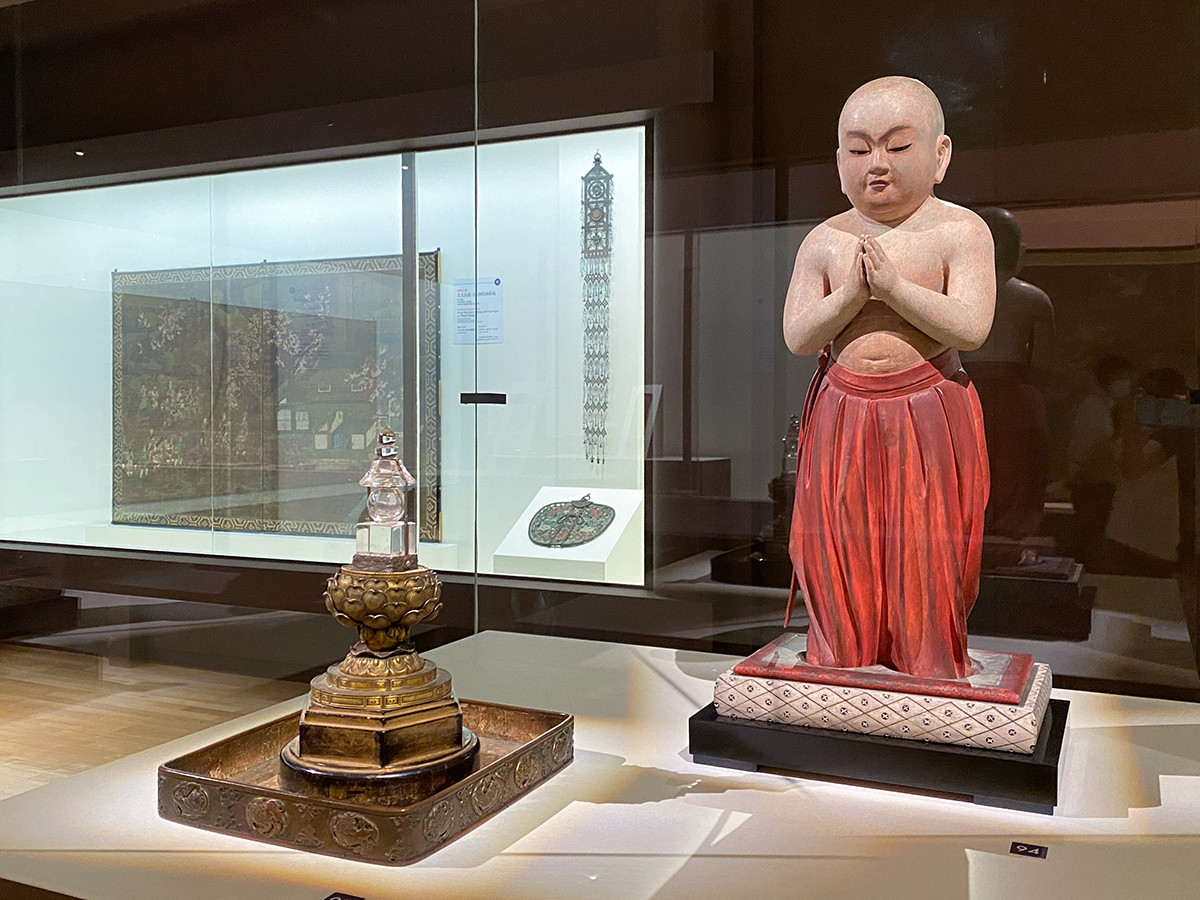 国宝《聖徳太子および侍者像》は聖徳太子の500年遠忌に制作された、法隆寺聖霊院の本尊。通常では拝観できない秘仏です。聖徳太子の威厳に満ちた姿とは対照的に、周囲の侍者はユーモラスな表情です。