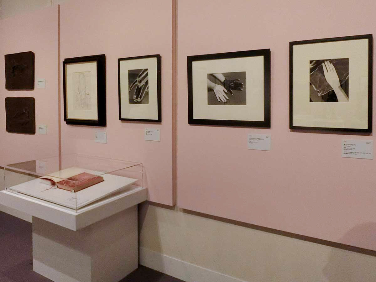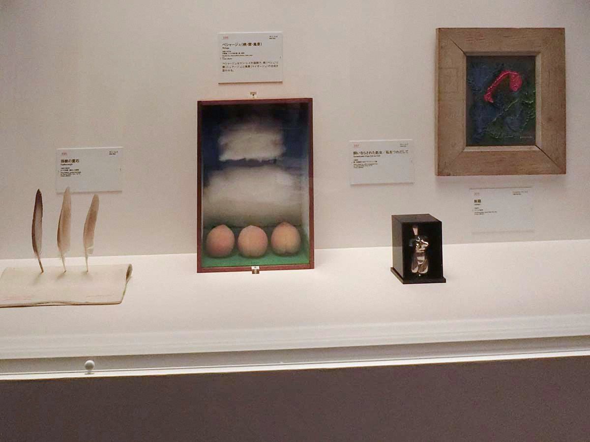 再びパリにもどったマン・レイが制作したオブジェは、身近な日用品を用いています。中央の《ベシャージュ》は、桃・雲・風景の語呂合わせで、三美神を表現。桃は裸体写真《祈り》を想起させられます。