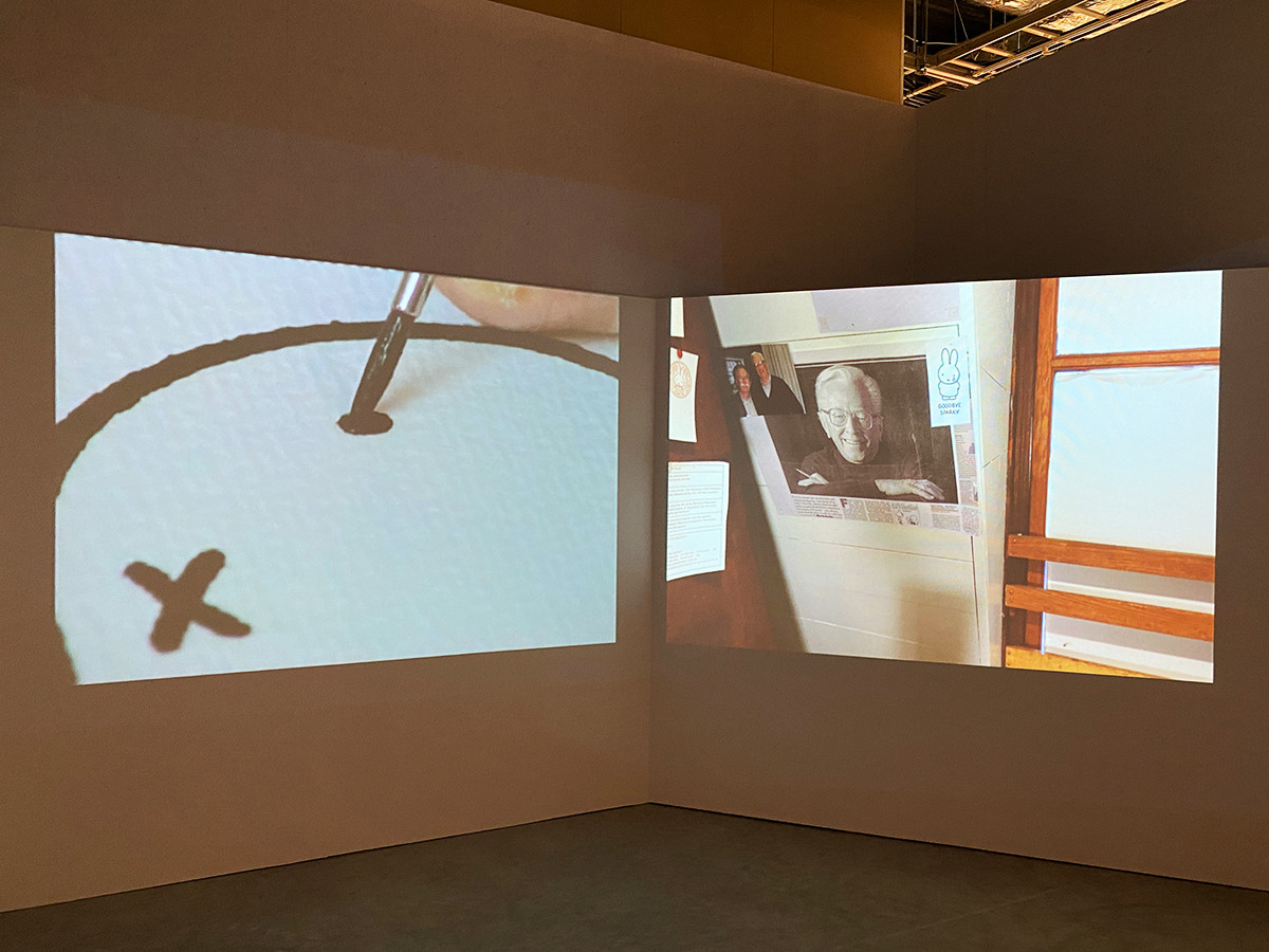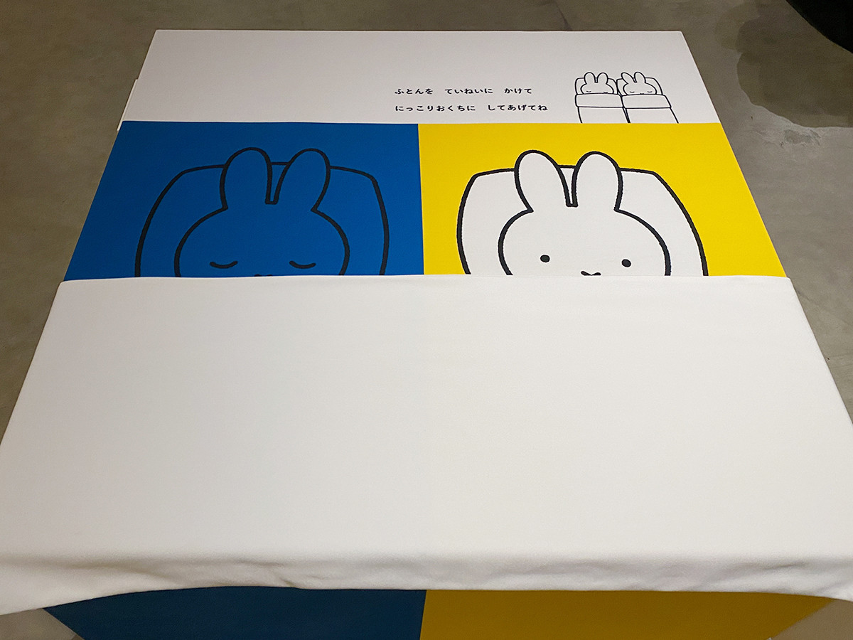 こちらは、本展アートディレクターの祖父江慎さんによる、ふとんをかけてあげるとにっこりほほえむミッフィー。ぴったりの位置に、ふとんをかけてあげてください。
