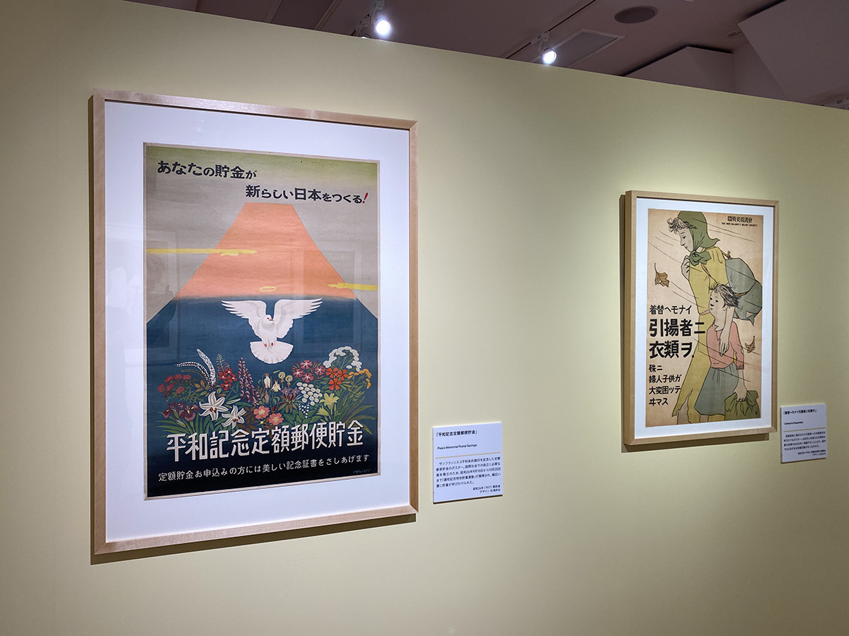 (左から)「平和記念定額郵便貯金」昭和26年(1951)デザイン:杉浦非水 / 「着替へモナイ引揚者ニ衣類ヲ.」昭和20年(1945)デザイン:山名文夫