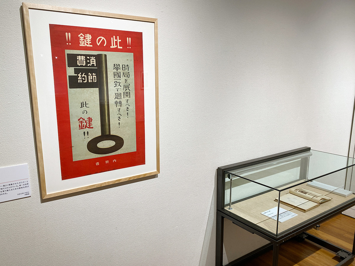 大正時代になると印刷技術はさらに発達し、日本でもポスター制作が盛んになりました。「此の鍵」も大正時代のポスター。第一次世界大戦後の不況を乗り越えるため、節制を呼びかけています。