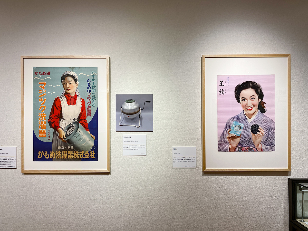 「マジック洗濯機」は手動で混ぜて洗う洗濯機です。「黒龍」は薬効クリームで、ポスターには人気女優の原節子や山本富士子が起用されていました。