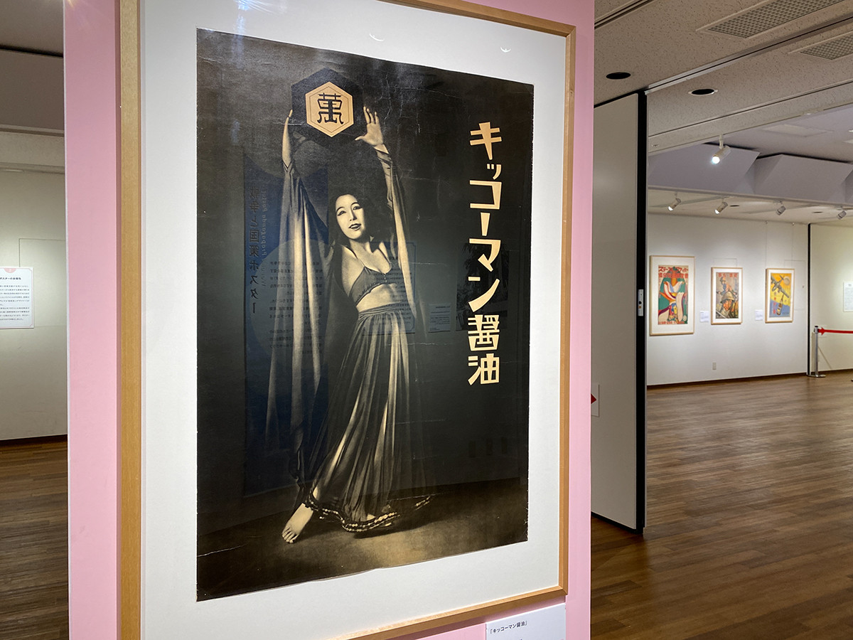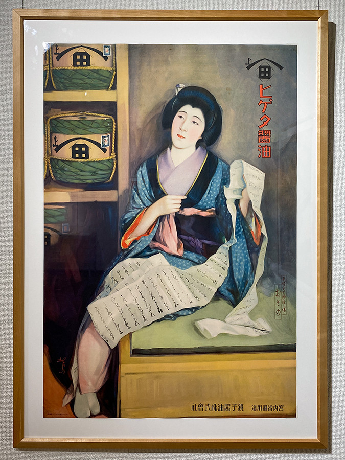 ヒゲタ醤油のポスターに描かれているのは、歌舞伎の演目「艶容女舞姿」の半七女房おその。作者の多田北烏(1889-1948)は人物画を得意とし、多くのポスターを手掛けています。