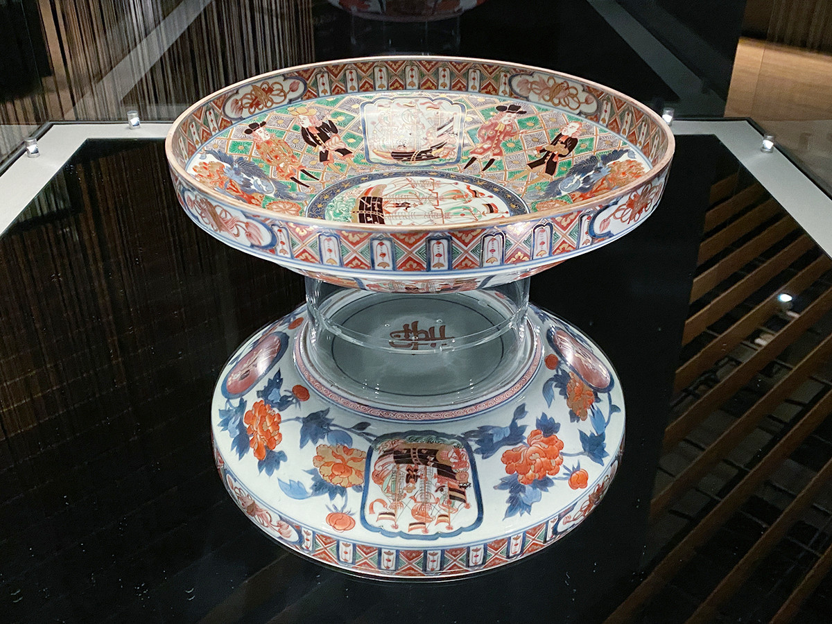 美術作品には正面や表面がありますが、ひっくり返すと思いがけない顔が隠れている事もあります。重要文化財《色絵五艘船文独楽形鉢》には底裏に「寿」の文字が記されており、それが分かると、器の内外に記されたオランダ船が、宝船のように位置付けられていた事がわかります。