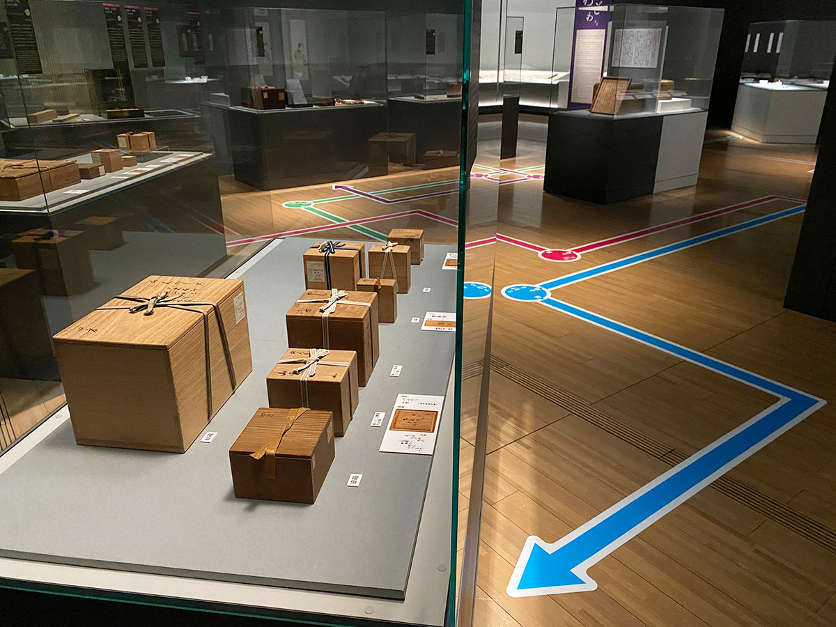 この章でまず目に入るのは、箱だけが入った展示ケース。床に書かれている線を辿ると、中身にたどり着くという趣向です。