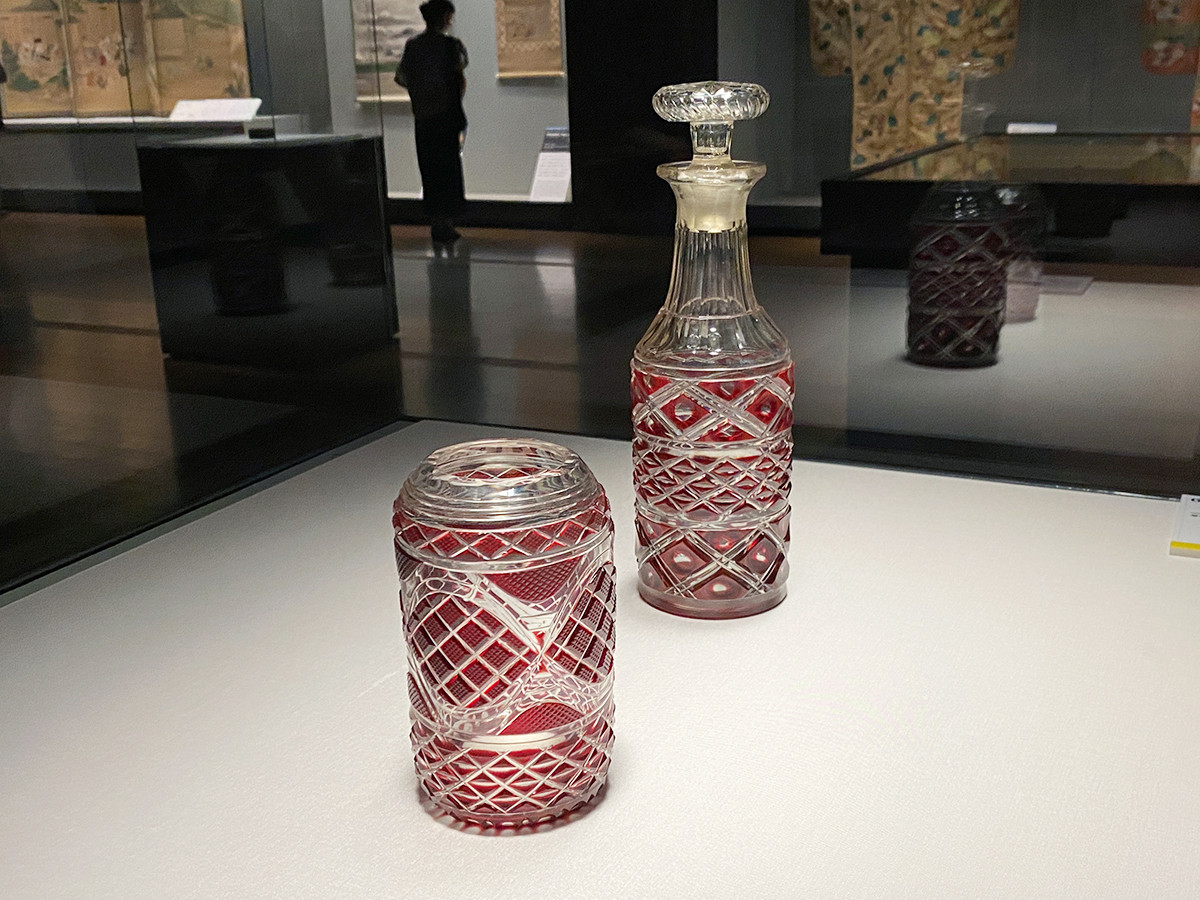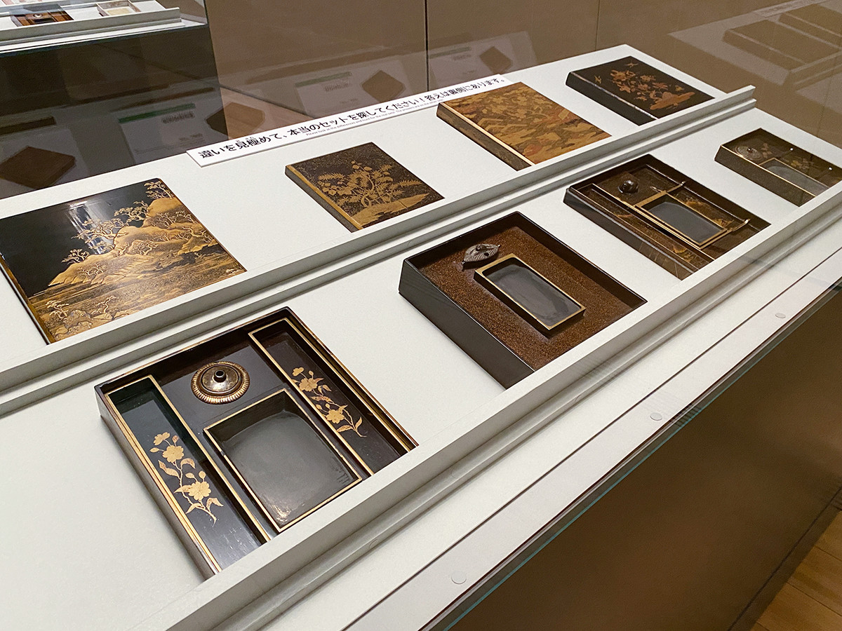 展示されているのは、身と蓋から構成されるセット物の作品たち。硯箱は本体と蓋が分けて展示されており、「違いを見極めて本当のセットを探して」と、促します。