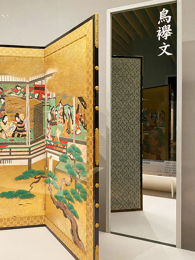 《邸内遊楽図屛風》は、妓楼の中でカード遊びや踊りに興じる人々を描いた作品。作品内に描かれた屛風は、裏側に円形文様がみえますが、この模様は「鳥襷文」(とりだすきもん)で、屛風の裏側としては定番の柄。実際にこの《邸内遊楽図屛風》も、裏側は鳥襷文です。