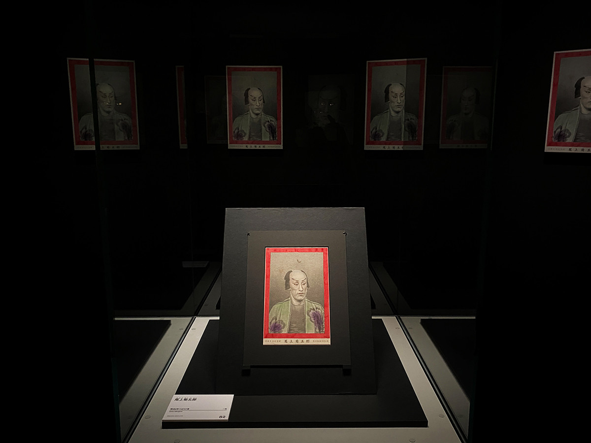 会場冒頭は、まるでお化け屋敷のよう。《尾上菊五郎》は、役者の肖像が浮世絵から写真へと移り変わる過渡期に、当時最先端の印刷技術で作られたものです。