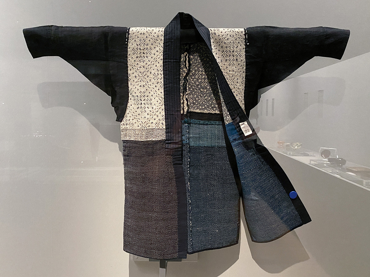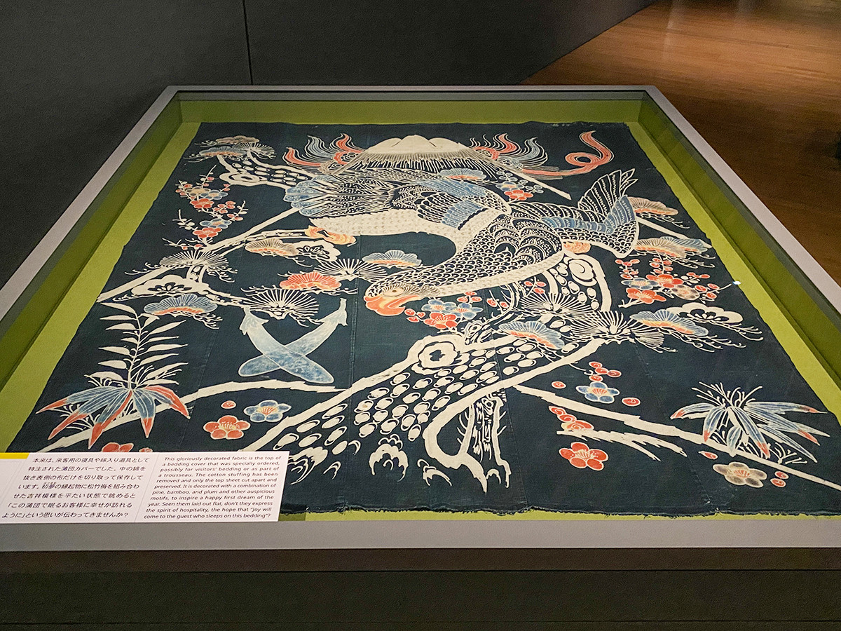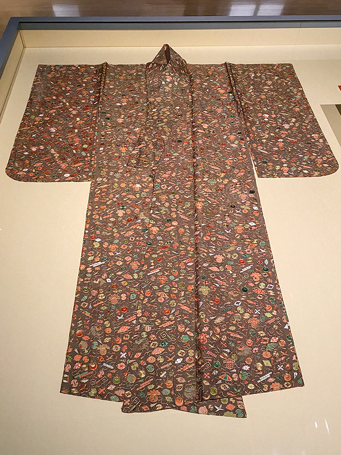 《茶練緯地宝尽模様腰巻》は、高貴な武家の女性が夏に着る正装。宝珠、打出小槌、宝巻などが緻密に刺繍で表現されています。中でも宝袋は、小さな袋の中の絵柄もそれぞれで違うという、驚異的な手仕事の技が見て取れます。
