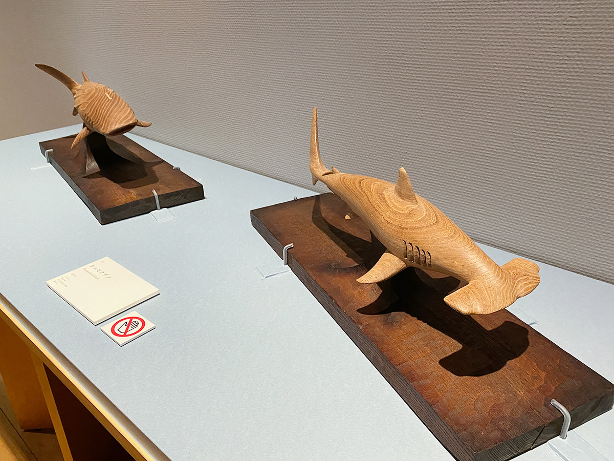 藤戸は1990年代に海の生き物を集中して制作しています。エビやカニなどの甲殻類は、小さなパーツごとに彫り、組み合わせて制作されています。