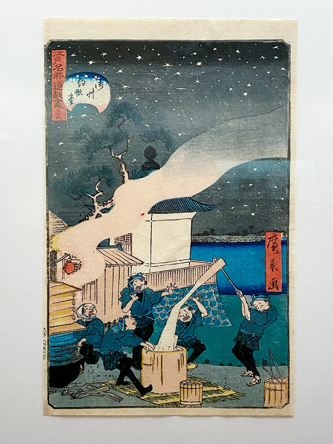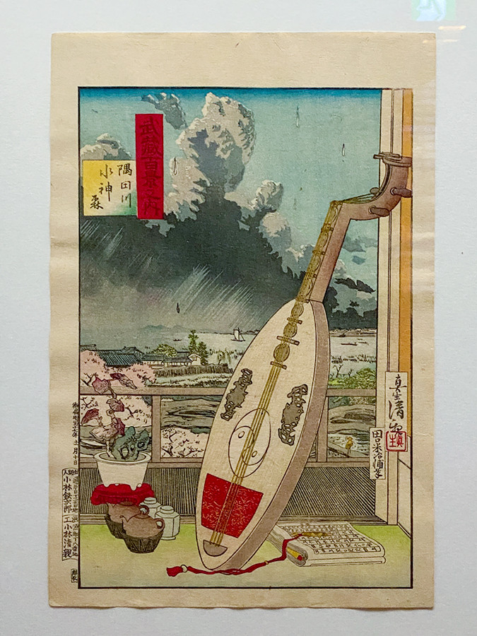 続いて、小林清親の《武蔵百景之内 隅田川水神森》。手前の座敷は雫が滴っており、奥に黒々とした雨雲。一枚の画面に、降雨と雨後の情景を描きました。座敷にある楽器は、当時流行していた月琴です。