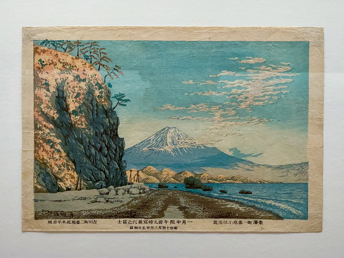 《薩た之冨士》で複雑なかたちの雲と美しい富士山を、水彩画を思わせるような爽やかな色彩で表現したのは小林清親です。