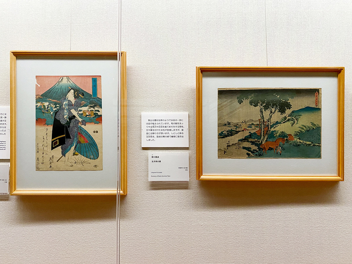 この後はテーマ別で分類されており、最初は「雨」。雨を描いた浮世絵作品はとても多く、さまざまな絵師が腕をふるっています。