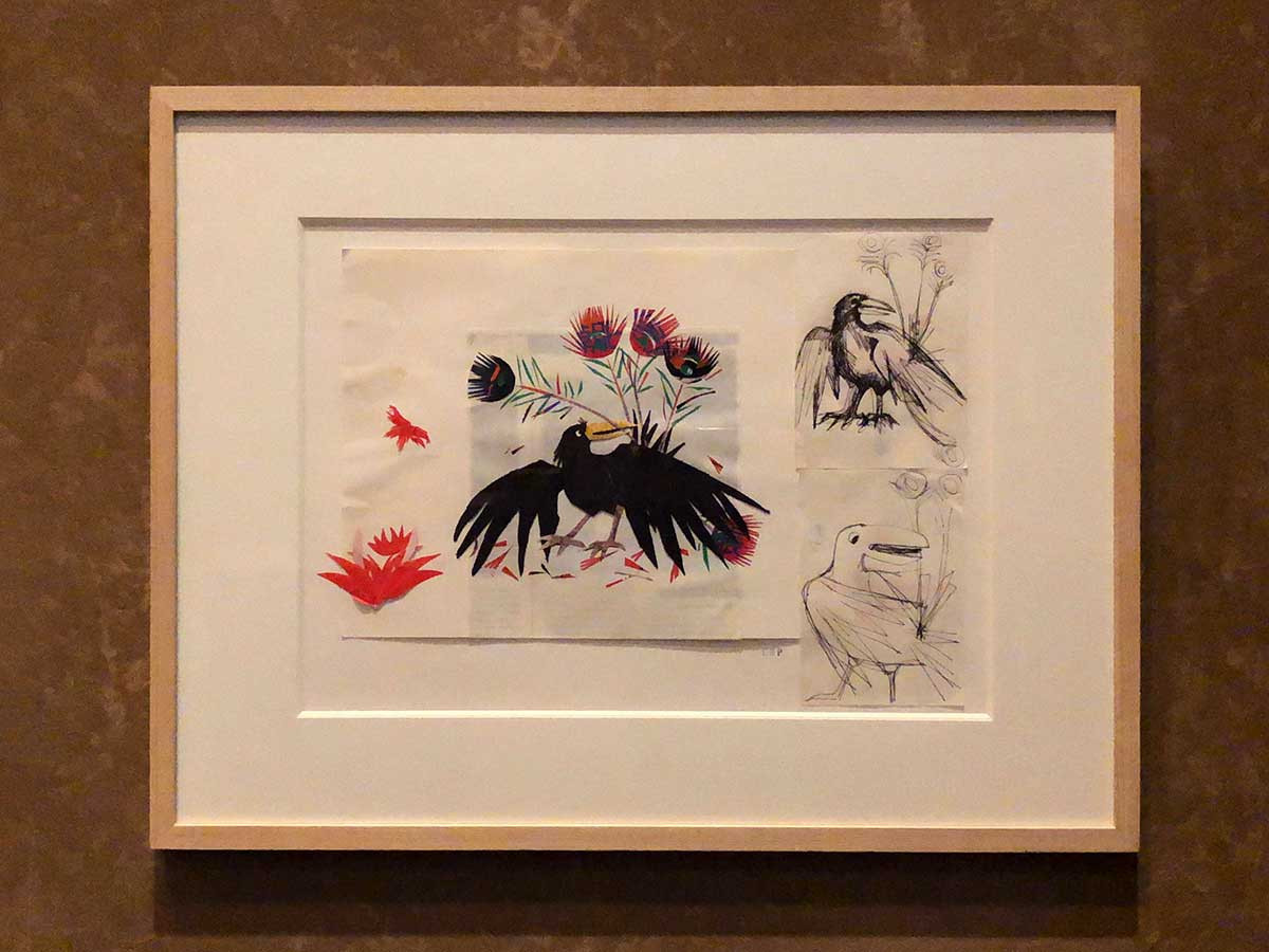 家族が寝静まってから限られたスペースで制作を行っていたシルヴィアは、完成作品が多くありません。今回展示された素描のコラージュは、夫の保田春彦がスケッチブックや紙片を整理して美術館に寄贈したものです。