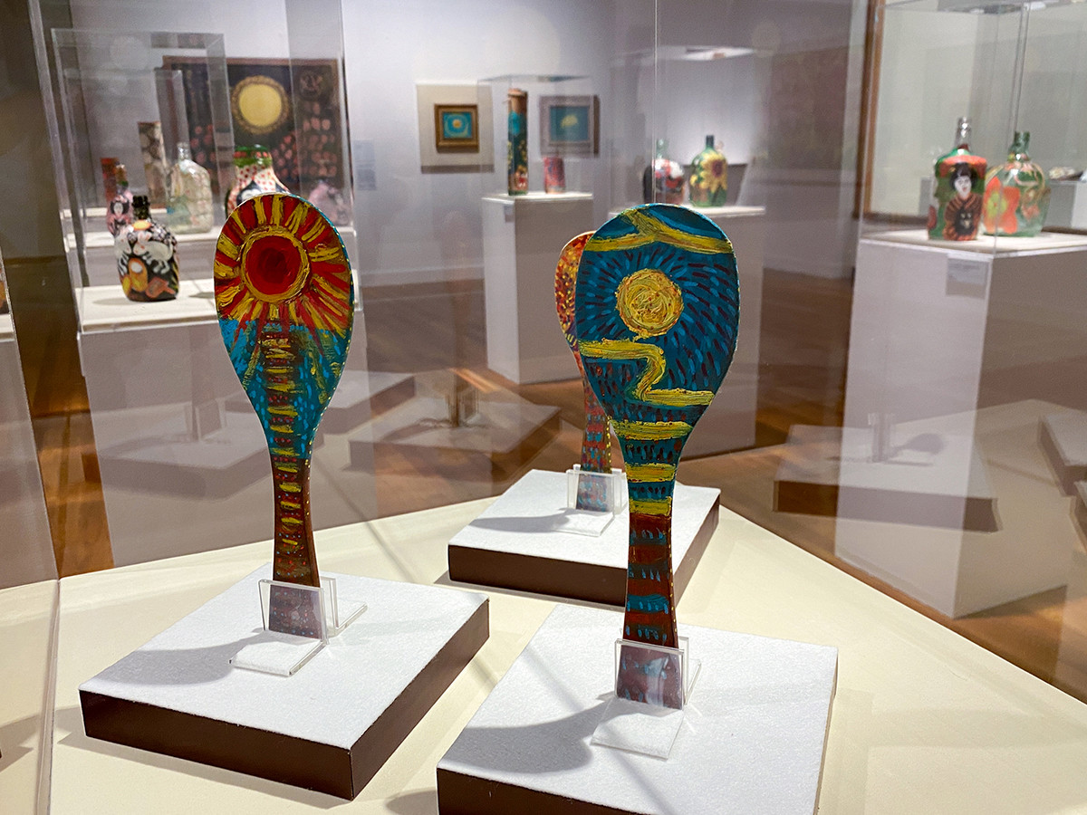 シスコは、描きたいという衝動を決して抑えませんでした。その創作の欲求は平面にとどまらず、木箱、竹筒、引き出し、空き瓶、そしてしゃもじにまで広がっていきます。