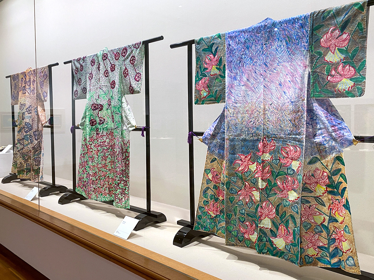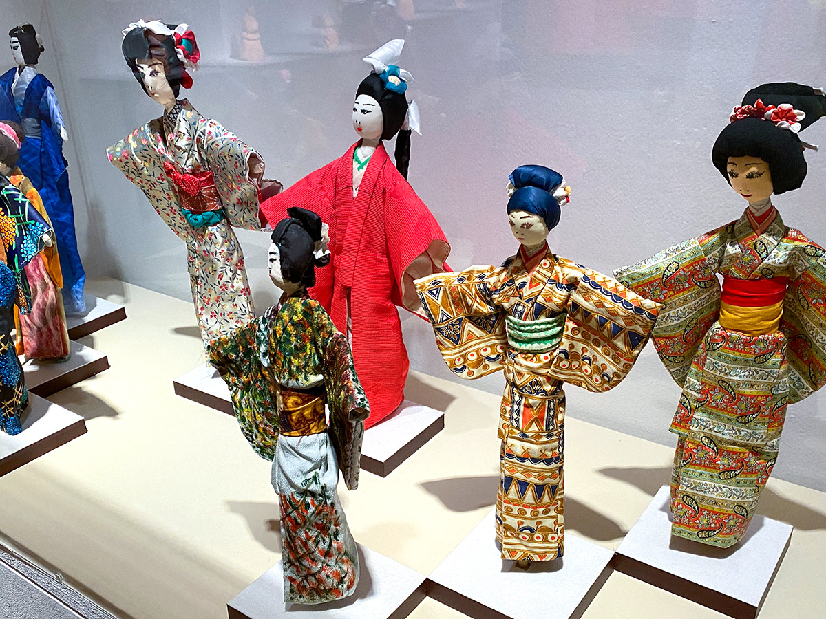 若い頃に習得した和裁の技術を活かして、和装の小さな人形も制作。襟元から裾の先まで絵柄を手描きした着物は、自分自身を着飾るために描いたものです。