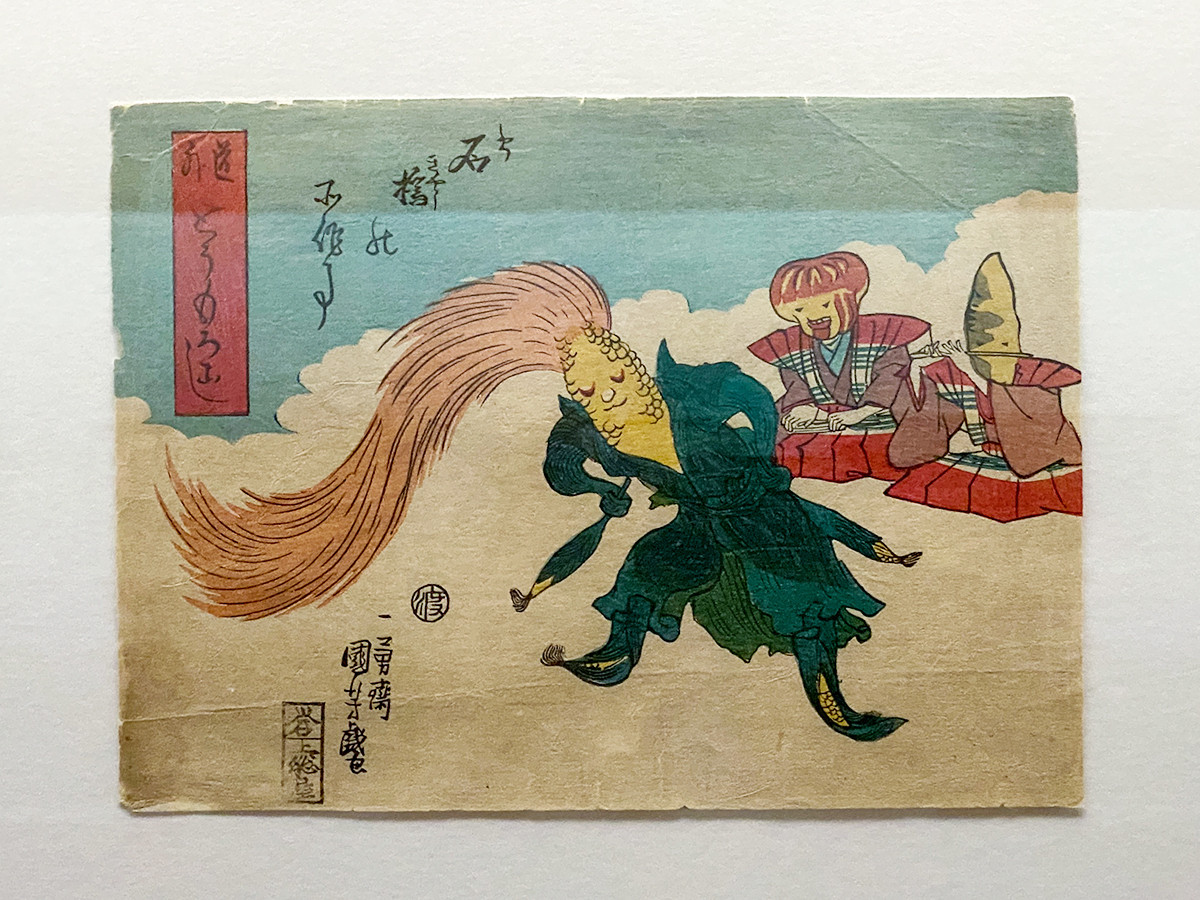 弘化2年(1845)、江戸で奇妙な形のとうもろこしが生えたと立て続けに話題となり、それを戯画に仕立てた作品と考えられています。