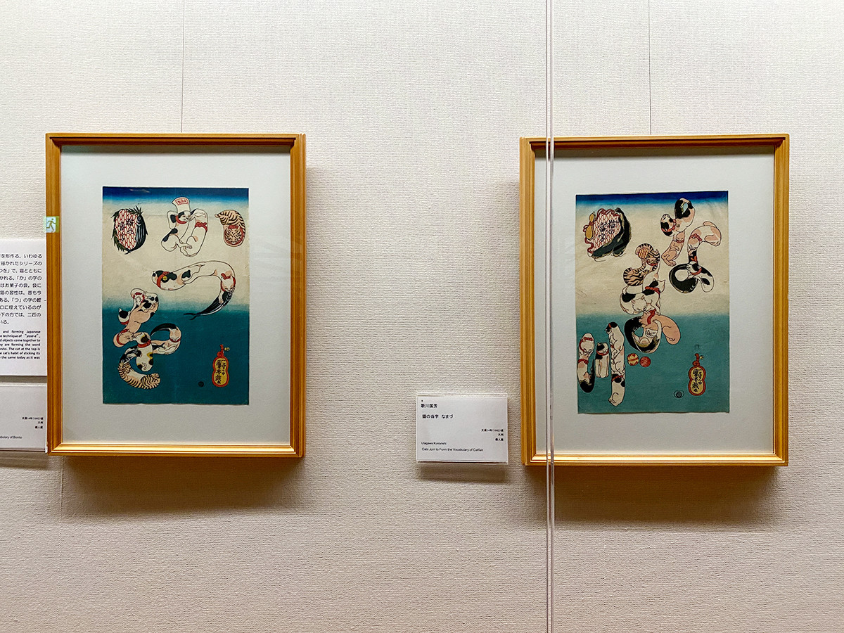 (左から)歌川国芳《猫の当字 かつを》天保14年(1843)頃 / 歌川国芳《猫の当字 なまづ》天保14年(1843)頃