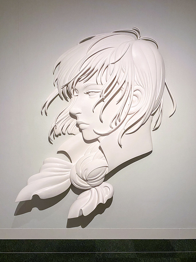𠮷田芙希子はレリーフを中心に、憧れの美青年の顔を制作する作家。顔だけが彩色もなく浮かび上がることで、まつ毛や唇などパーツの美しさが際立っています。