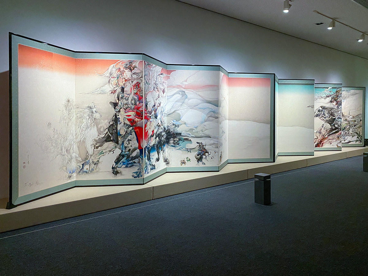 入口近くの大きな屛風は、朝霞市にアトリエを構える入江明日香の作品です。一見すると日本画のようですが、銅版画をベースにしたミクストメディアです。