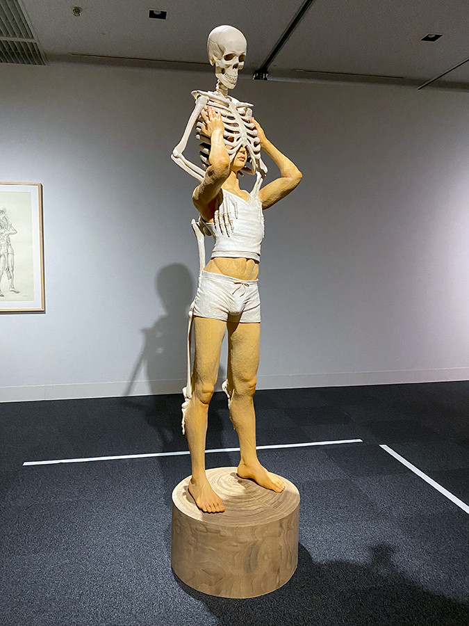 若い男性が骸骨を被るような、ひときわ目を引く木彫は、金巻芳俊の作品《空刻メメント・モリ》。「メメント・モリ」は「死を忘ることなかれ」という西洋の警句です。