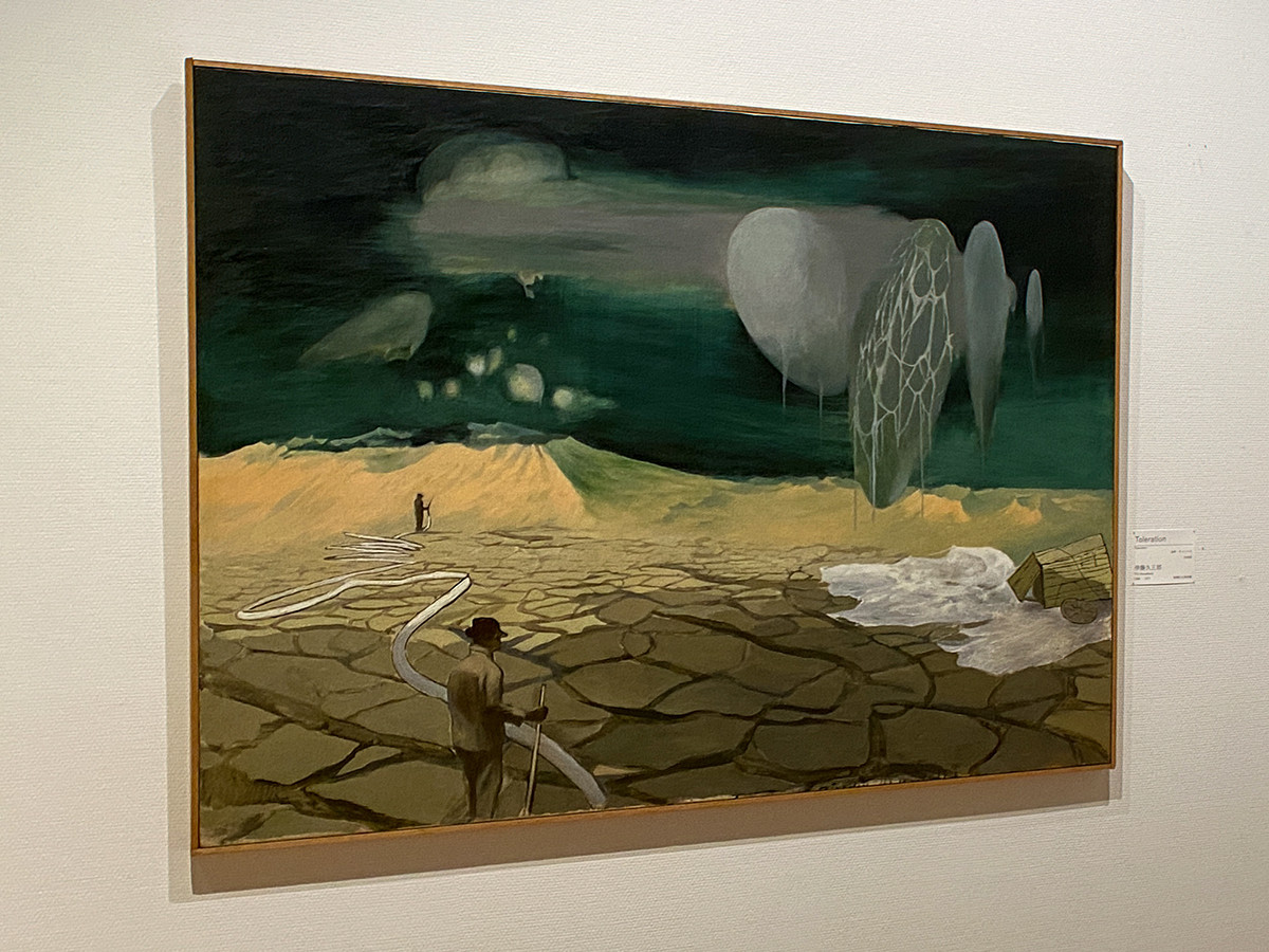 地割れのある大地とスーツに身を包み、帽子を被った2人の人物が立つ様子が描かれているのは、伊藤久三郎の《Toleration》。ホースを手に、干上がった大地に水を撒こうとしていますが、大地の広さに戸惑っているようにもみえます。