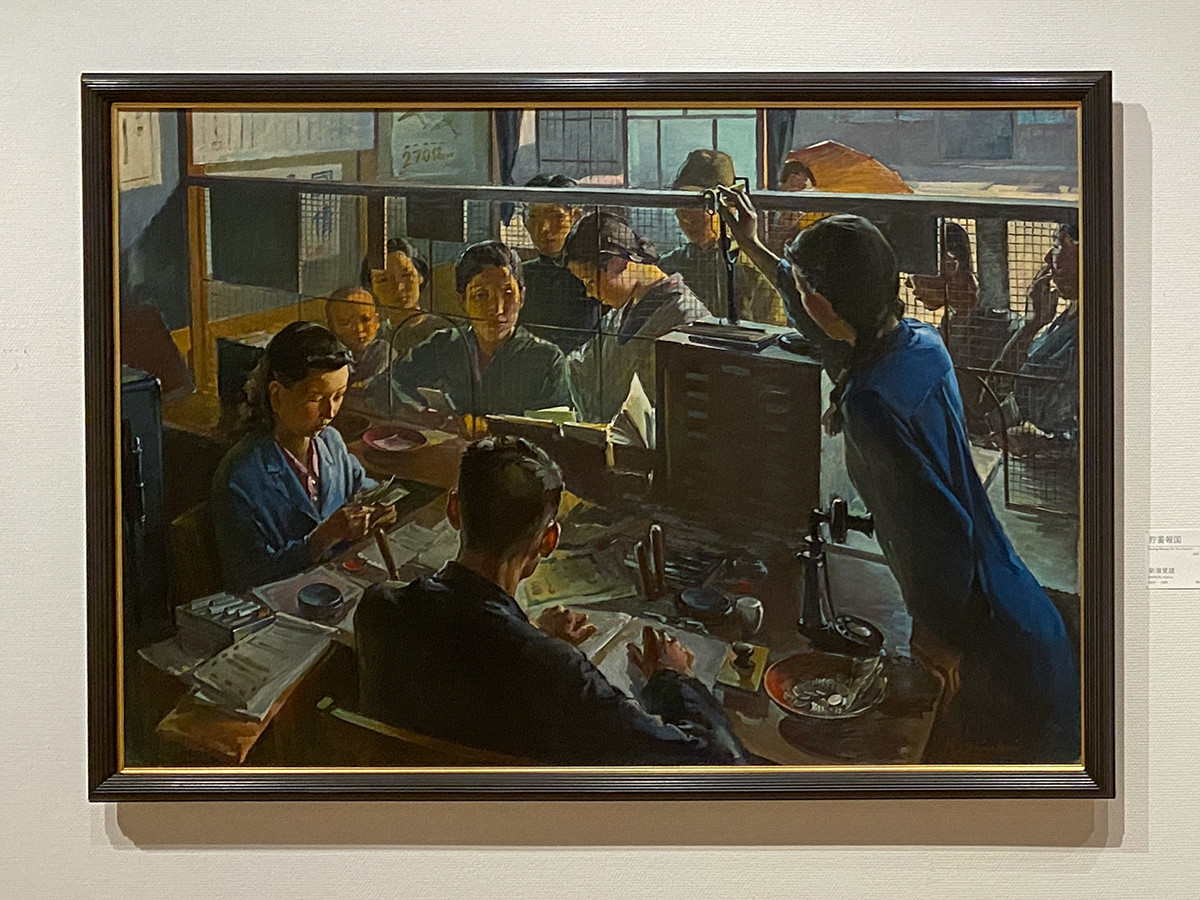 新海覚雄の《貯蓄報国》もそのひとつ。軍事費の増加に伴い、貯蓄は国に報いるものとして奨励されました。セーラー服姿の女性も働く郵便局のカウンターには、貯蓄のために多くの人が詰めかけています。