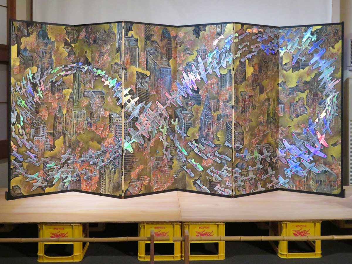 ∞を描いて編隊飛行する零戦に攻撃され、燃えさかるニューヨークの街並み。衝撃的です。この作品は、襖に日本経済新聞を貼った上に描かれ、加山又造「千羽鶴」、また「洛中洛外図屛風」からの引用がなされ、重層する問いを発しています。制作が「9.11」の5年前であることに驚かされました。