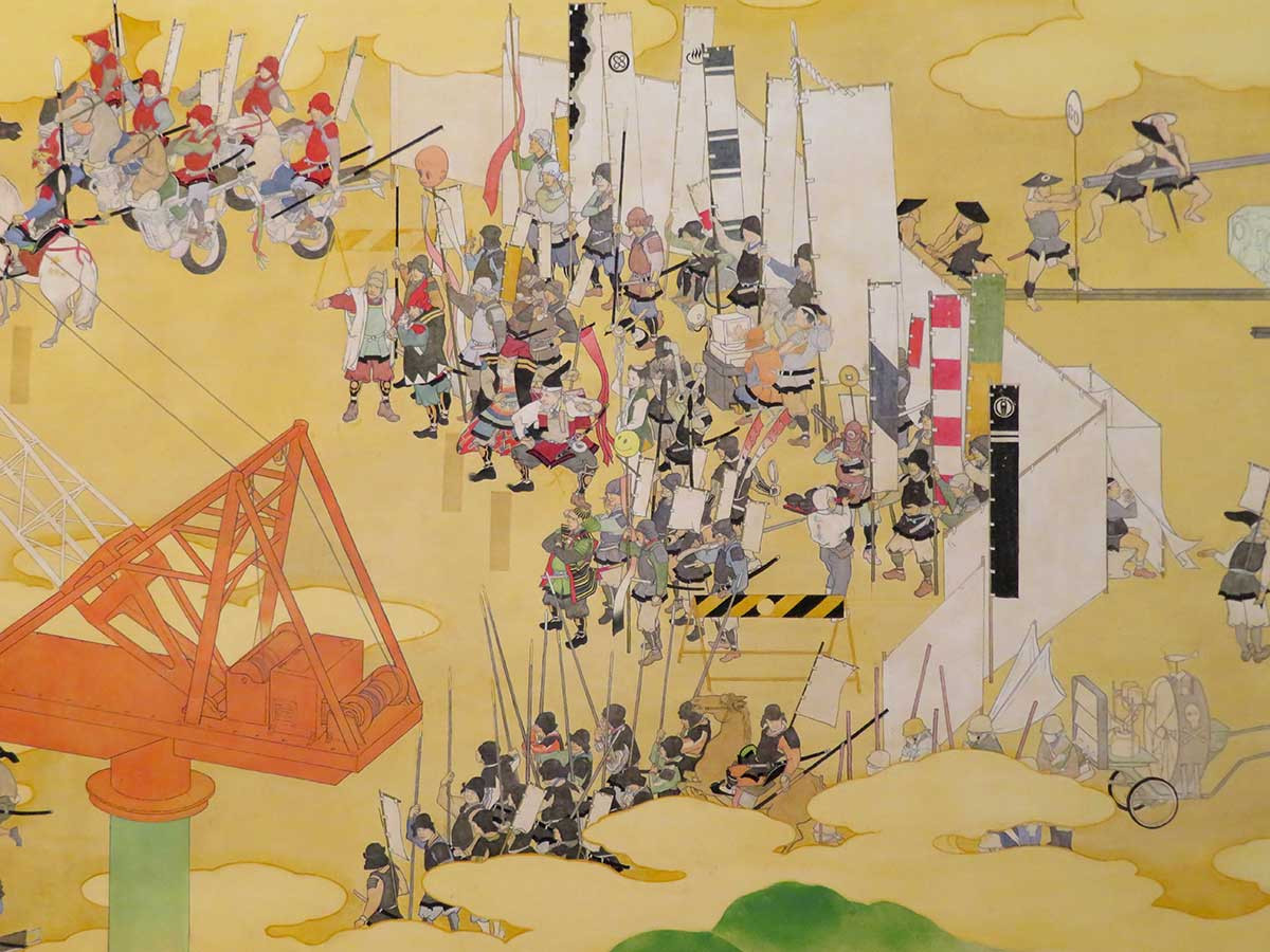 山口晃(やまぐちあきら)(1969年生まれ)のやまと絵のような作品は、油彩絵具で描かれています。「當卋(とうせい)おばか合戦」はよく見ると、現代人も混じり、武士がバイクに乗っていたり。画面の塗り残しは油彩画ならではのもの。山口は古典的な日本美術をベースに、あらゆる境界を融合してしまいます。