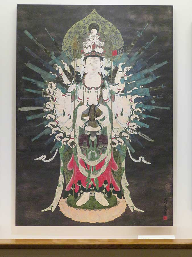 天明屋尚(てんみょうやひさし)(1966年生まれ)がアクリル絵具で描いた「ネオ千手観音」は、慈悲をもたらす仏の数多の手に武器が握られています。「9.11」の翌年の制作。天明屋は日本美術の古典的要素を用いて現代を表現する「ネオ日本画」を提唱しています。