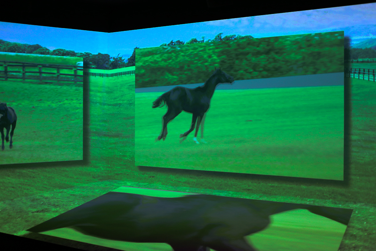 奥の「ライヴシアター Thoroughbred」は、4面スクリーンと5.1chサラウンドによる、劇場型アトラクション。壮絶なデッドヒートとなった第83回日本ダービーの映像は、映像と音に包み込まれる大迫力です。