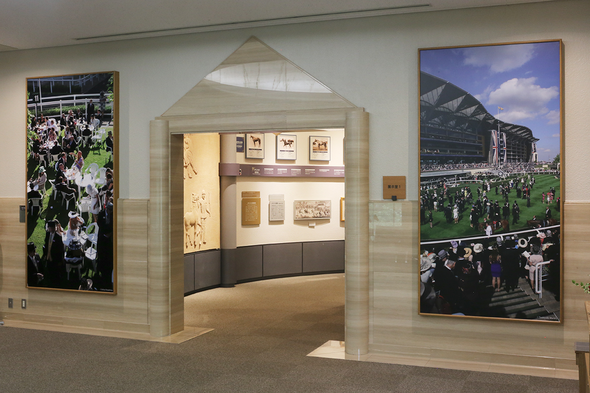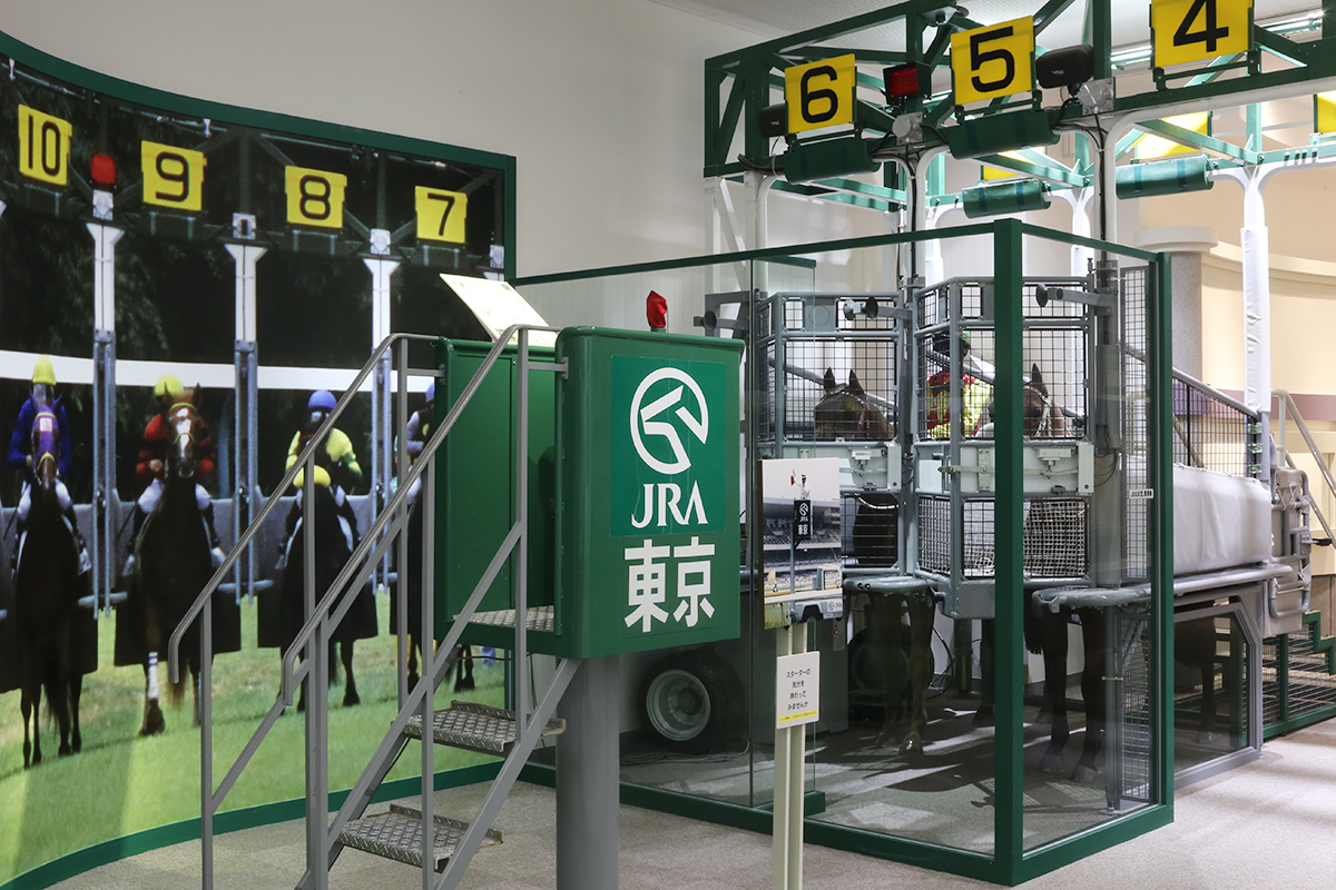 回廊型の展示室1では、300年に及ぶ世界と日本の競馬史を紹介。歴史に残る名馬の写真や、貴重な実物資料が並びます。先に進むと、JRAが実際にレースで使用しているスターティングゲートも展示されており、発走委員(スターター)気分で、ゲートを開ける事ができます。