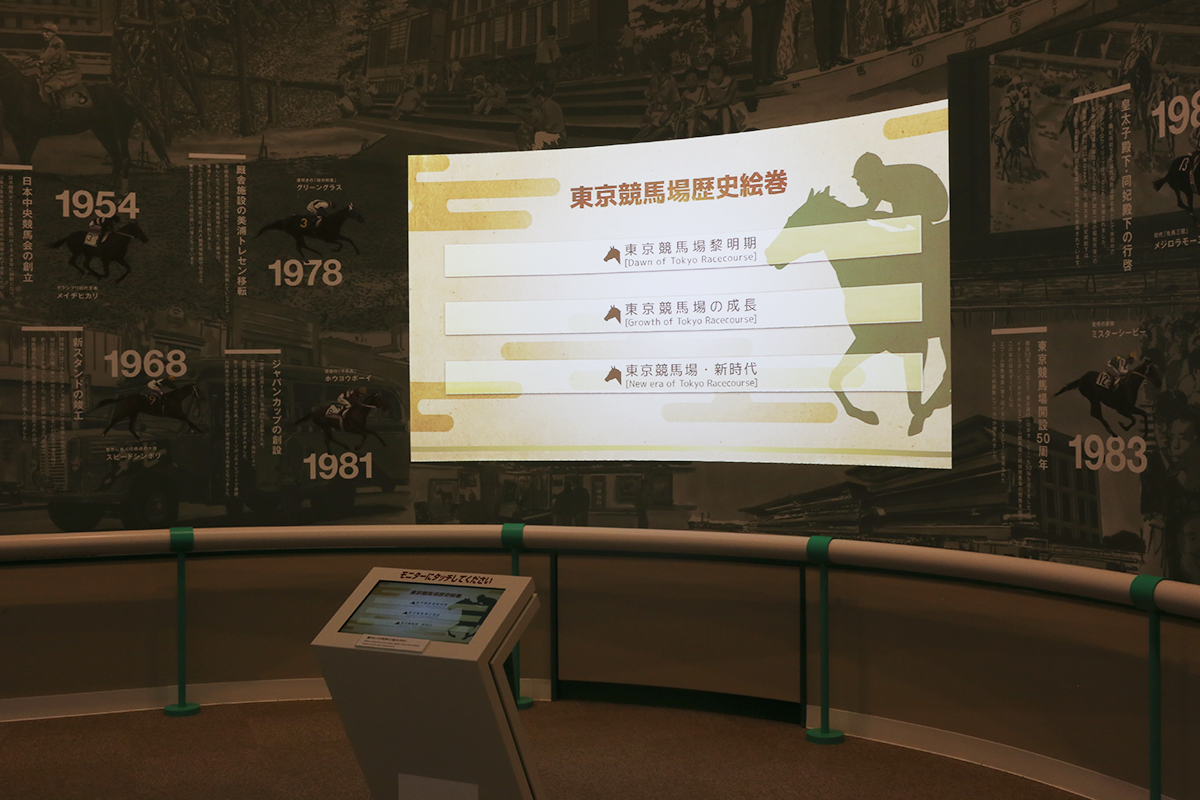 「東京競馬場歴史絵巻」も、今回のリニューアルで新設されました。1933(昭和8)年の東京競馬場の開場から現在まで、絵巻のようにつづられた長い歴史の中から、好きな時代を選んでお楽しみいただけます。