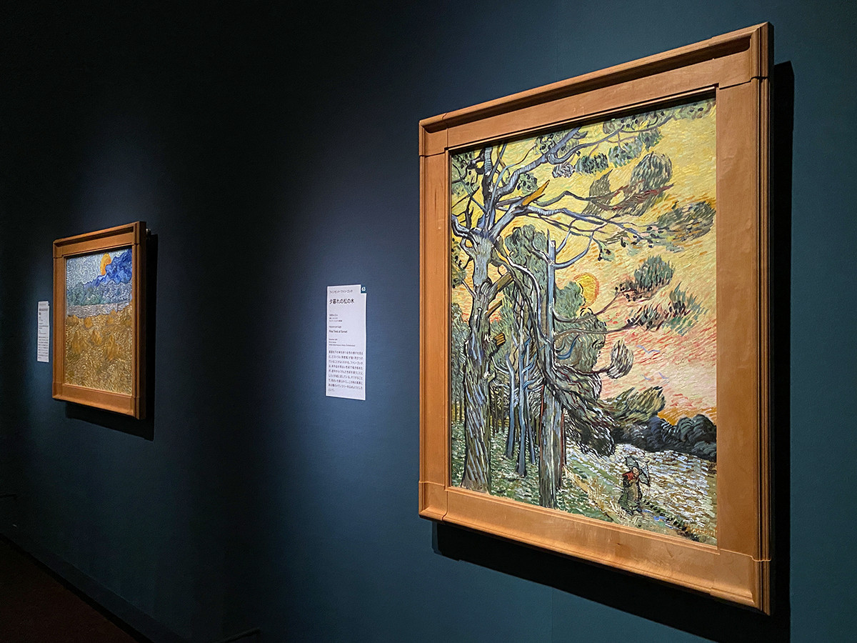 (左奥から)フィンセント・ファン・ゴッホ《麦束のある月の出の風景》1889年7月 / フィンセント・ファン・ゴッホ《夕暮れの松の木》1889年12月 ともにクレラー=ミュラー美術館