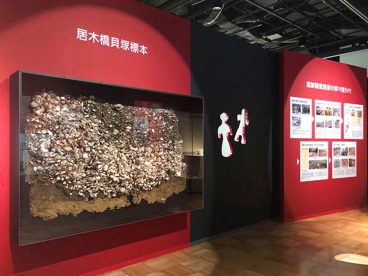 4章は「考古学の未来」。 発掘調査や研究の成果は、市民が参加し体験できるように広く公開する必要があります。ここでは、堆積した貝塚の断面をはぎ取ったものも展示。通常、写真や図面による記録保存が一般的ですが、実際の貝塚を見ることで、堆積状況や質感を感じることができます。