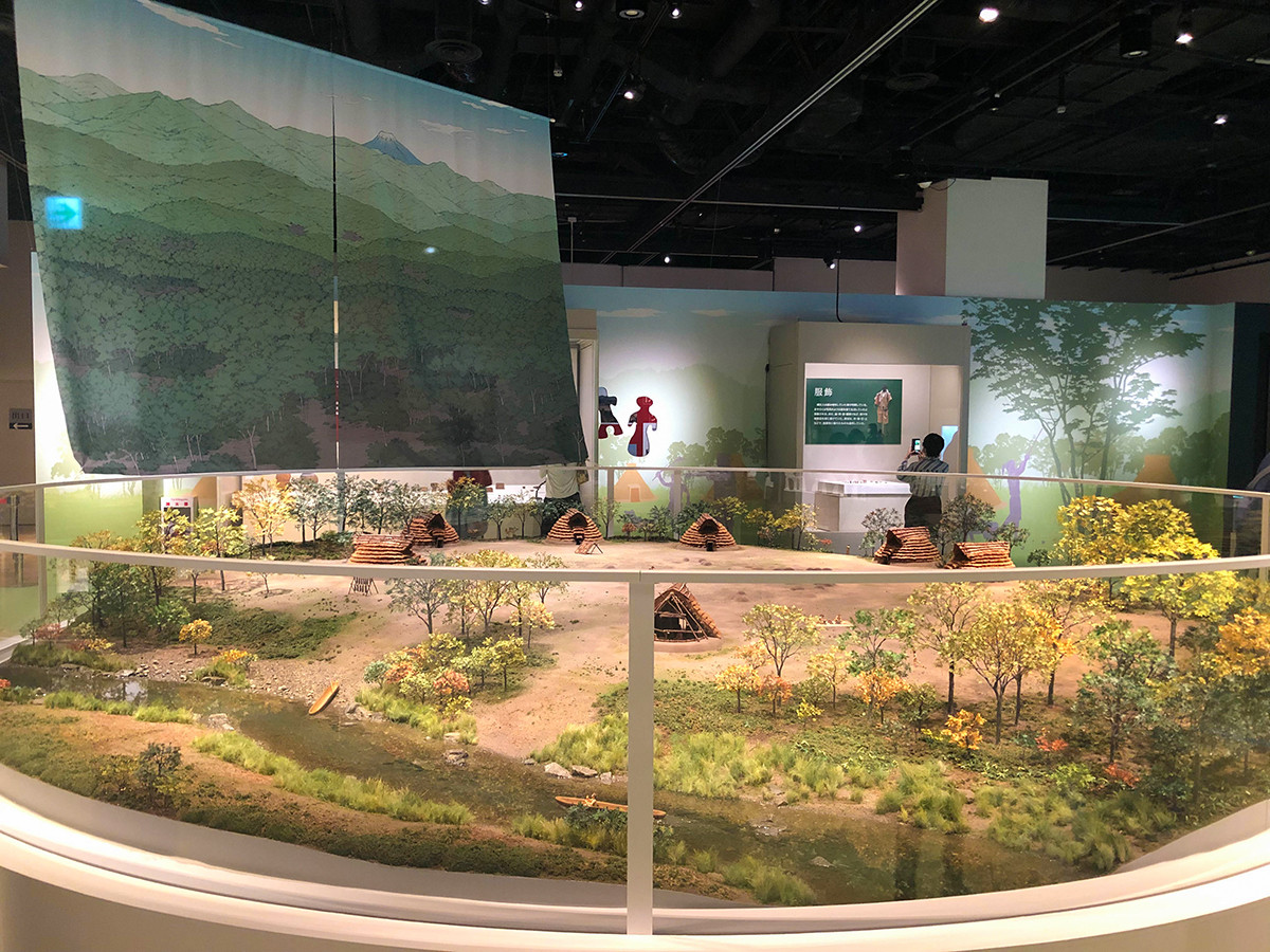 一方、丘陵部の遺跡の紹介として集落の景観を再現した「縄文のムラ」を再現。縄文時代中期の環状集落(多摩ニュータウンNo107遺跡)をモデルとした1/20復元模型です。